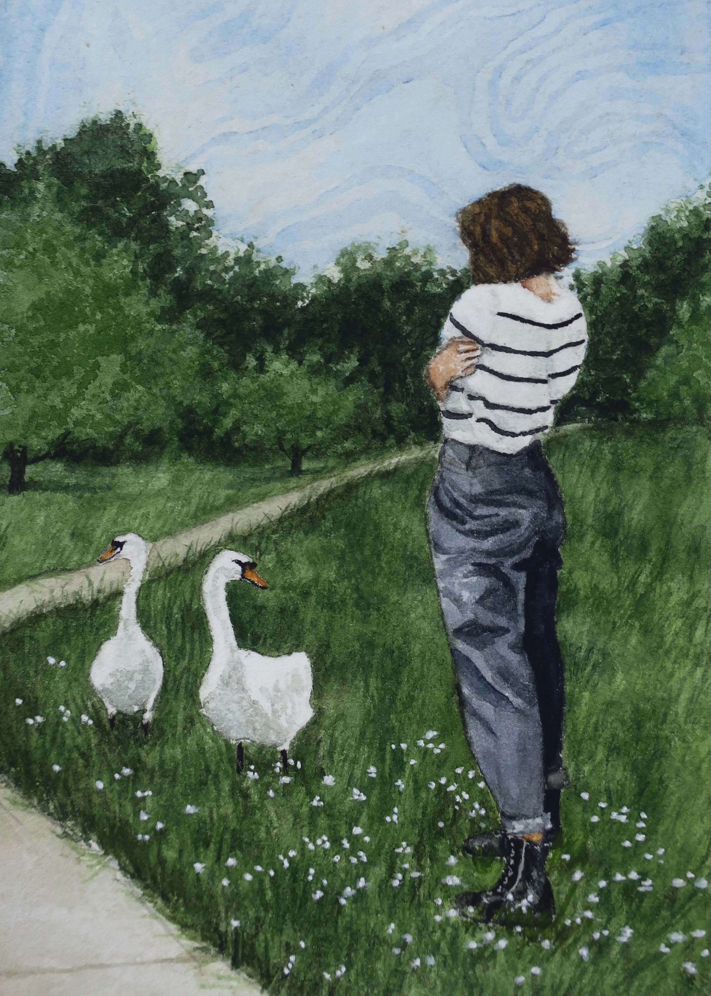 "Hesitation," watercolor on Rives BFK paper, 4 in. x 6 in., 2022.